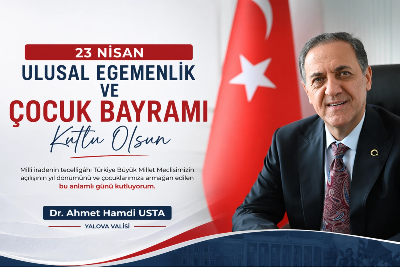 Yalova Valisi Dr. Ahmet Hamdi Usta, 23 Nisan Ulusal Egemenlik ve Çocuk Bayramı dolayısıyla yayımladığı mesajında, Türkiye Büyük Millet Meclisi’nin açılışının milli egemenliğin en güçlü sembolü olduğunu belirterek, çocukların Türkiye’nin geleceğinde üstleneceği role dikkat çekti. Vali Usta, mesajında 23 Nisan 1920 tarihinin yalnızca Türkiye Büyük Millet Meclisi’nin açılış günü olmadığını, aynı zamanda Türk milletinin kendi kaderine bizzat yön verdiği tarihi bir dönüm noktası olduğunu ifade etti. Milli Mücadele’nin en zorlu şartlar altında millet iradesiyle yürütüldüğünü vurgulayan Usta, “Egemenlik kayıtsız şartsız milletindir” anlayışının Cumhuriyet’in temel taşı olduğunu kaydetti.