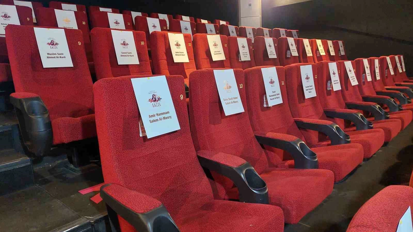 Gazze’de katledilen çocukların isimlerinin koltuklarda yazılı olduğu salondaki gösterime seyirci alınmadı.